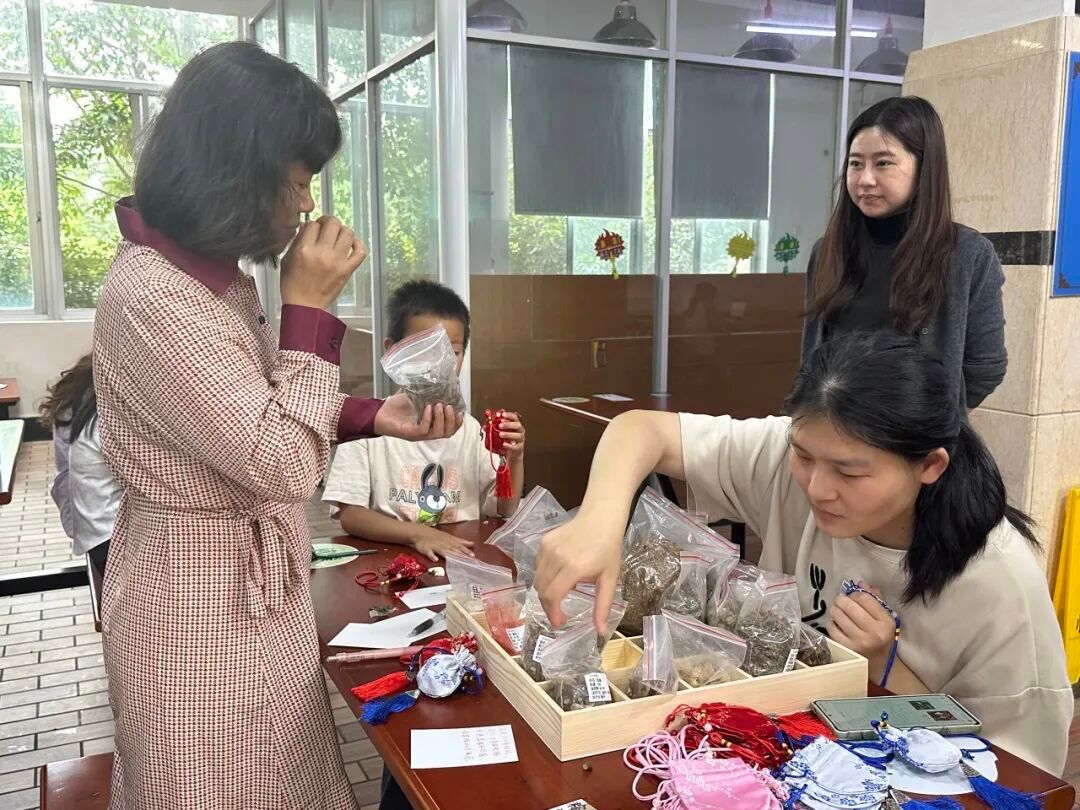 端午节,除了吃粽子之外,按照传统习俗,也会佩戴香囊。中药香囊源自中医里的“衣冠疗法”,香囊小巧玲珑,香爽周身,寓意美好,参与活动的师生们根据自己的需求和喜好尝试制作香囊,从而阻挡毒虫污秽之物、防御疾病,同时也让中医文化融入了日常生活。