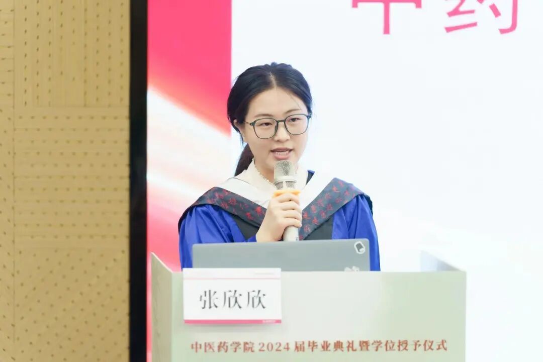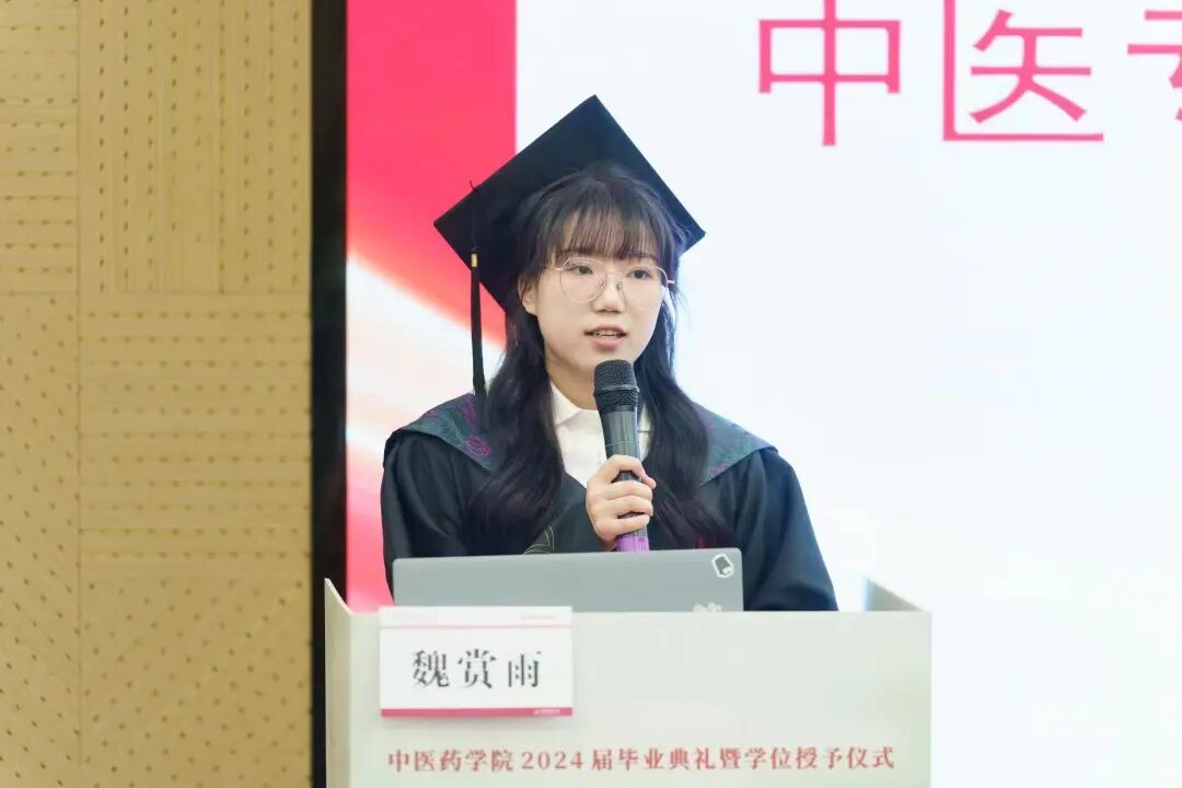 中药专业研究生代表张欣欣、中医专业本科生代表魏赏雨代表全体毕业生发表感言,她们分享了入校以来的所思所悟、所学所得,表达了对学校、学院和老师的感恩之情,并表示将牢记习近平总书记嘱托,弘扬中医药传统文化,用实际行动展现中医药学院学子的责任和风采。