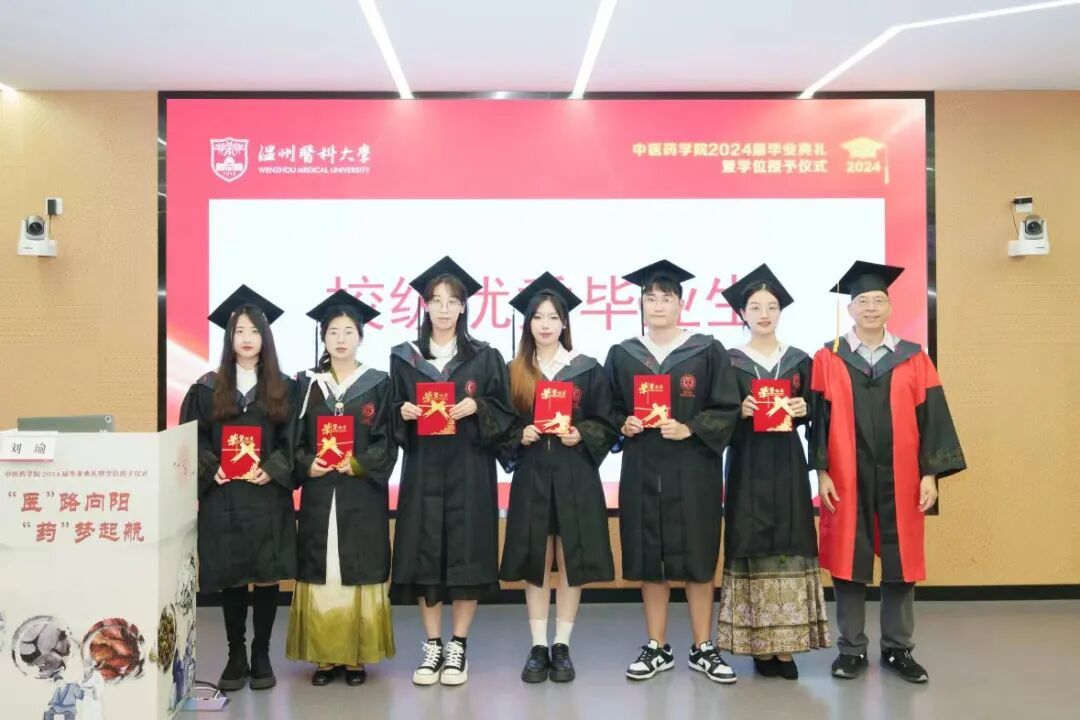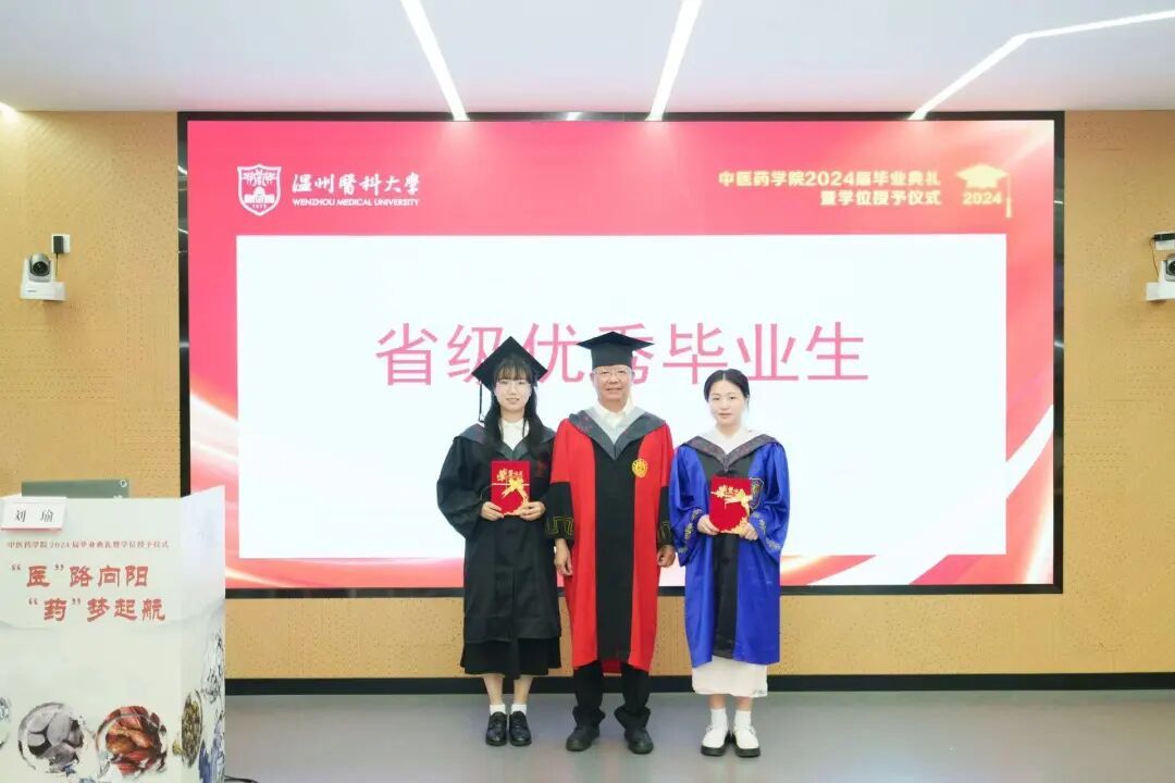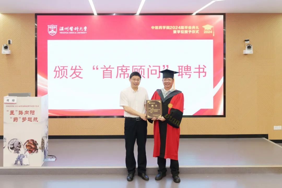 6月24日上午,中医药学院2024届中医学专业本科生和中药学、药学专业研究生毕业典礼在6A107教室隆重举行。校党委副书记章成斌,全国名老中医药专家学术经验继承指导老师、浙江省名中医程锦国,中国医学科学院学部委员、国家岐黄学者、中医药学院学术院长谢恬,温州市中医院党委书记王庆来,温州市中西医结合医院党委副书记、院长姜文兵,中医药学院党委书记、副院长刘瑜,中医药学院党委委员、副院长袁拯忠,中医药学院党委副书记、纪委书记梁栋,中医药研究院执行院长姜程曦,校中医肛肠病研究所副所长、第二临床医学院中医临床教研室副主任郑晨果出席典礼,中医药学院各行政科室负责人、全体教师和2024届中医学专业本科生和中药学、药学专业研究生参加典礼,毕业典礼由中医药学院党委书记、副院长刘瑜主持。