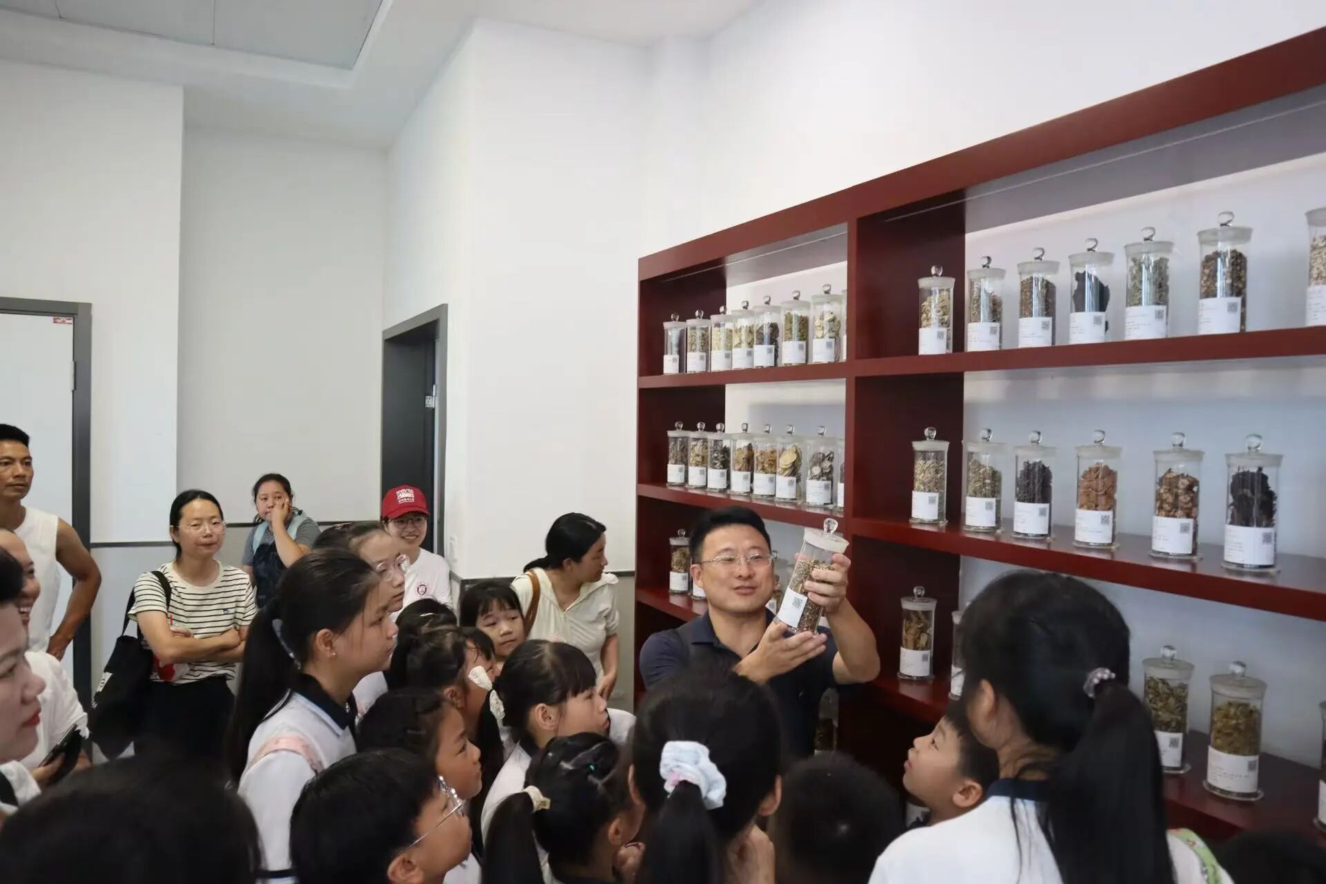 在弥漫着草木清香的标本馆内,朱寅荻如数家珍。他引导小学生们驻足于浙八味等道地药材前,揭示“一方水土养一方药”的奥秘。朱老师指着形态各异的标本,向孩子们娓娓道来:“同学们,看这个颜色鲜艳的,它叫红花,可别小瞧它,在古代,它可是重要的活血化瘀良药呢!而这株看起来小小的植物,是薄荷,它的叶子不仅摸起来清凉,还能用来泡茶,喝了能提神醒脑。”朱老师不仅介绍了中药的功效,还讲述了许多有趣的中医药历史故事和民间传说,小学生们听得津津有味,一双双好奇的眼睛紧紧盯着标本,不时发出惊叹声。