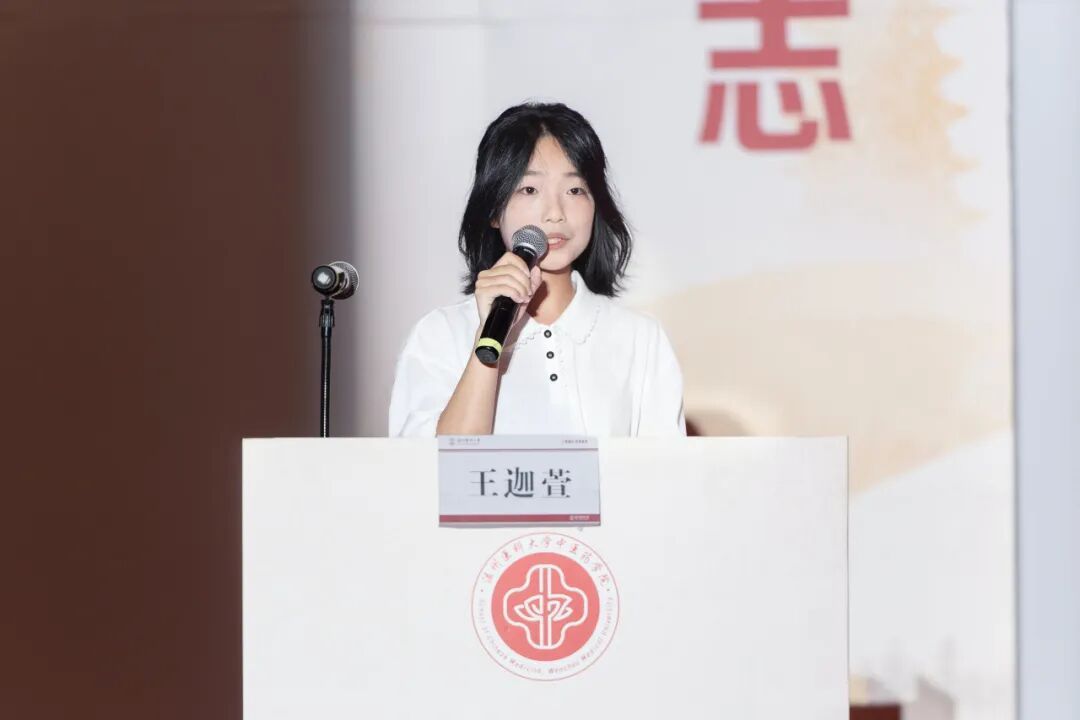 王迦萱代表全体新生发言。她分享了自幼与中医药结缘的点滴,从药草清香到《濒湖脉学》的启迪,再到接过录取通知书时的笃定,表达了对踏上中医之路的坚定与憧憬。她表示,将恪守“修身明志,传道以远”的院训,以温郁金般的坚韧和中正之心勤学笃行,传承岐黄薪火,为中医药事业发展贡献青春力量。
